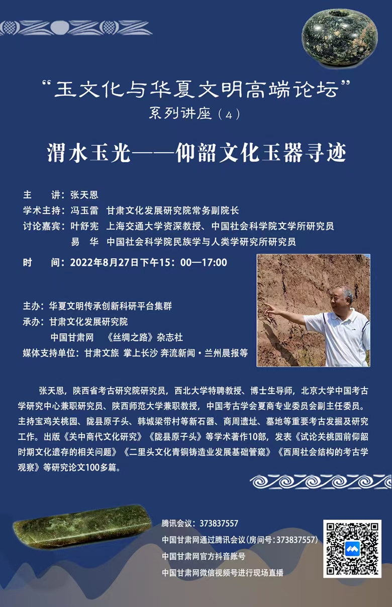 中國甘肅網8月28日訊  27日下午15:00—17:00,由西北師范大學華夏文明傳承創新科研平臺集群主辦,甘肅文化發展研究院、中國甘肅網、《絲綢之路》雜志社聯合承辦的“玉文化與華夏文明高端論壇”第四講《渭水玉光——仰韶文化玉器尋跡》成功舉辦。