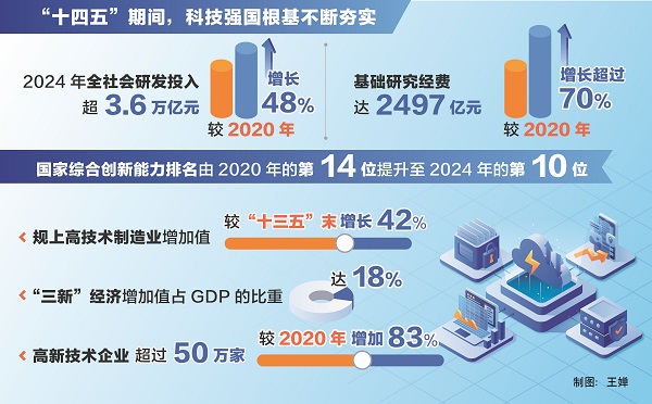 “這五年,科技創新能力穩步提升,科技強國根基不斷夯實。”陰和俊說,我國科技投入持續增加,2024年全社會研發投入超3.6萬億元,較2020年增長48%;基礎研究經費達2497億元,較2020年增長超過70%,在量子科技、生命科學、物質科學、空間科學等領域取得一批重大原創性成果;國家實驗室體系建設穩步推進,國家科研機構、高水平研究型大學科研能力不斷提升,科技領軍企業加快培育成長;北京、上海、粵港澳大灣區國際科創中心支撐引領和輻射帶動作用不斷增強,深圳-香港-廣州躍居全球百強創新集群榜首;國家綜合創新能力排名由2020年的第14位提升至2024年的第10位。