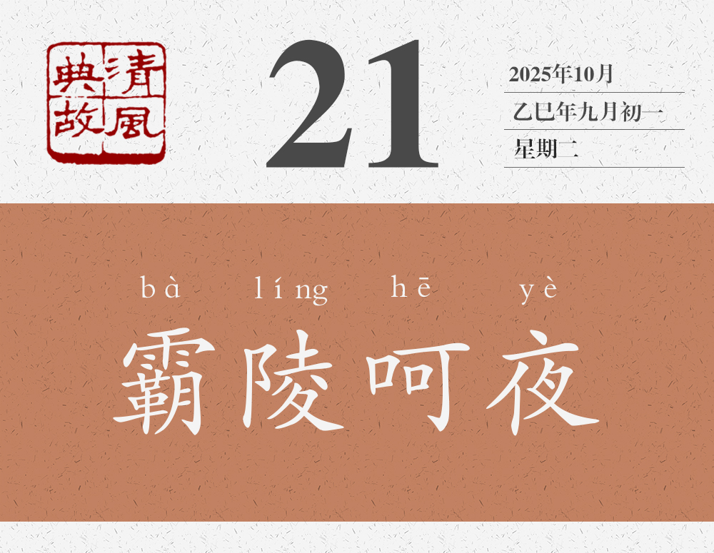 故事是說,有一天晚上,李廣帶著一名隨從,和別人一起去田野間飲酒,回來的時候,已經是深夜了。到了霸陵亭,正遇上霸陵縣尉。碰巧的是,霸陵縣尉也醉了,于是呵斥李廣止步。李廣的隨從就說:“這是以前的李將軍。”縣尉一聽,更來氣了:“就算他是現在的李將軍也不得夜行,何況他是以前的李將軍呢?”無奈之下,李廣只能和隨從一起住在霸陵亭下。