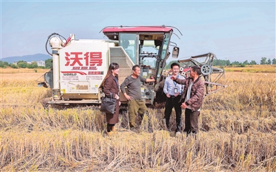 糧食安全是“國之大者”。安徽省含山縣紀委監(jiān)委聚焦高標準農(nóng)田建設(shè)管理中的突出問題開展一線走訪,推動“糧田”變“良田”。圖為該縣紀檢監(jiān)察干部在環(huán)峰鎮(zhèn)城北村水稻收割現(xiàn)場了解相關(guān)情況。歐宗濤 攝