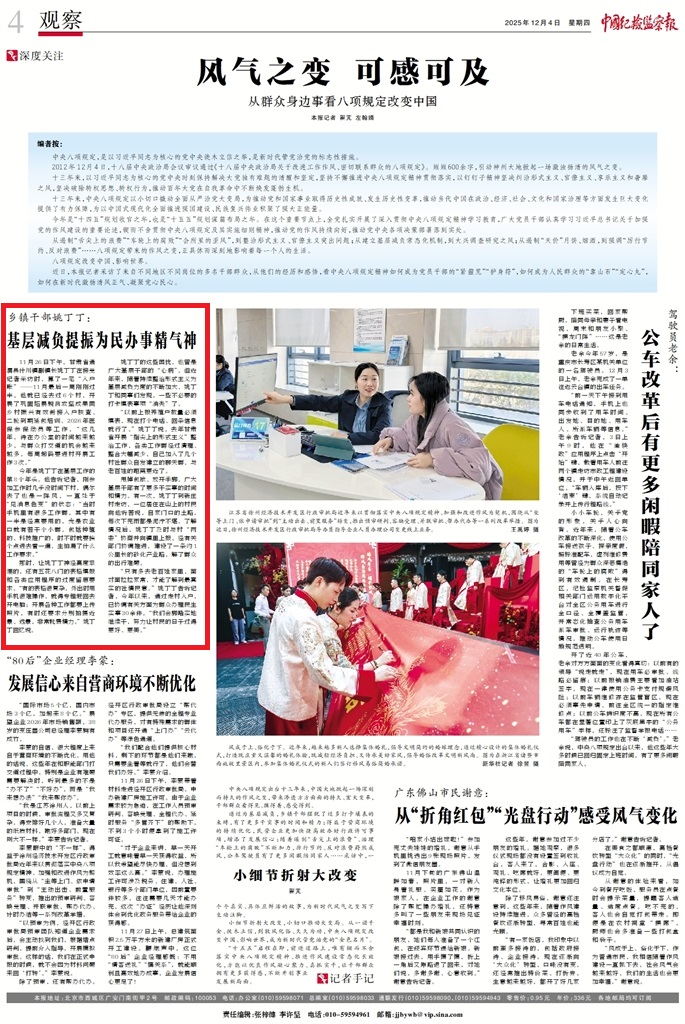 從遏制“舌尖上的浪費”“車輪上的腐敗”“會所里的歪風”,到整治形式主義、官僚主義突出問題;從建立基層減負常態化機制,到大興調查研究之風;從遏制“天價”月餅、煙酒,到強調“厲行節約、反對浪費”……八項規定帶來的作風之變,正具體而深刻地影響著每一個人的生活。