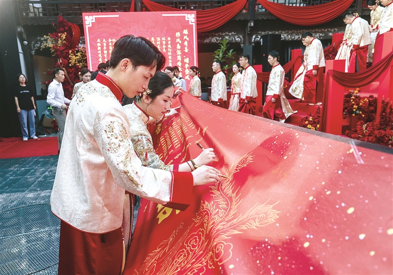 風成于上、俗化于下。近年來,越來越多新人選擇集體婚禮,倡導文明簡約的婚嫁理念,通過精心設計的集體婚禮儀式,打造既莊重又溫馨的婚禮體驗,既減輕經濟負擔、又傳承美好家風,倡導婚俗改革文明新風尚。圖為在浙江省諸暨市西施故里景區內,參加集體婚禮儀式的新人們簽訂移風易俗簡婚承諾。新華社記者 徐昱 攝