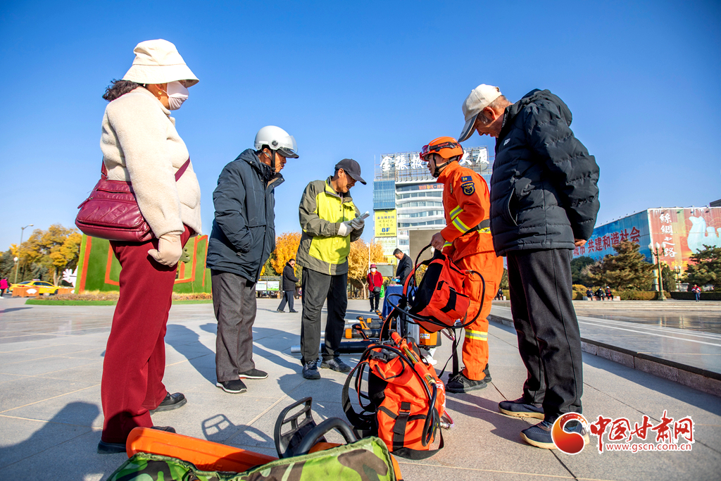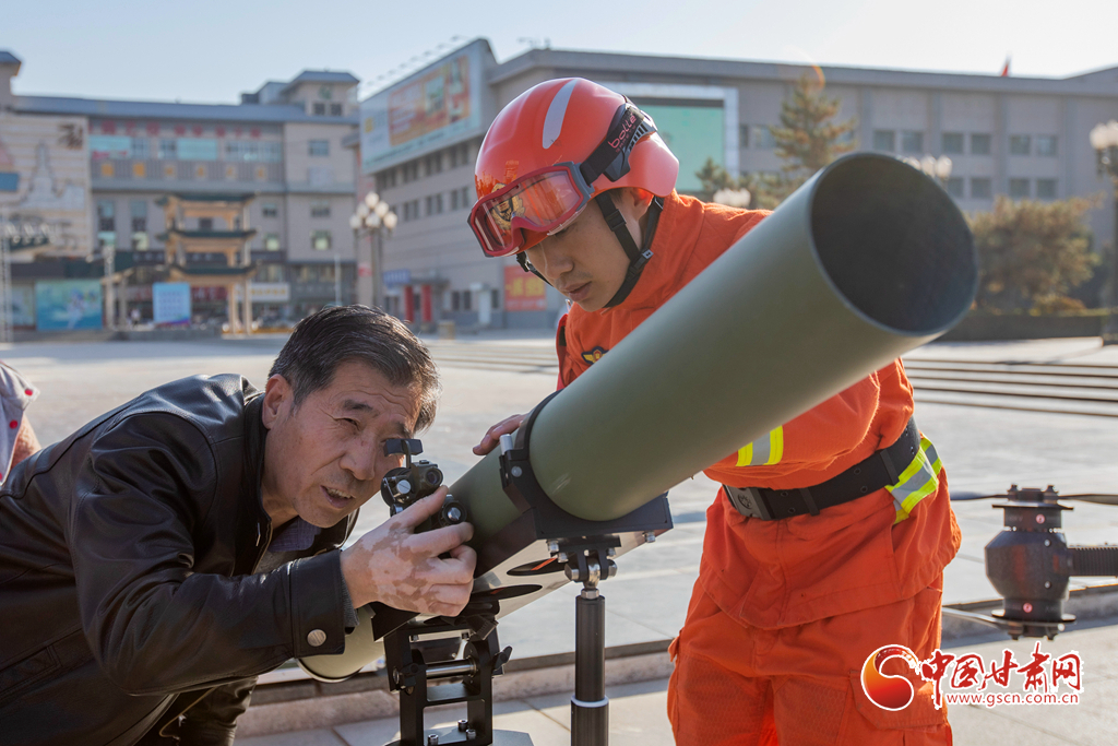 消防隊員給裕固族群眾講解地震救援裝備液壓擴張器在救援中的用途