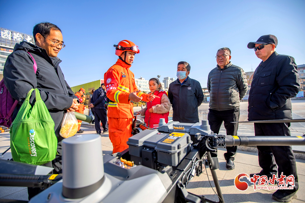 消防隊員給群眾講解無人機遠程投送救援物資和處置懸崖峭壁煙點的用途
