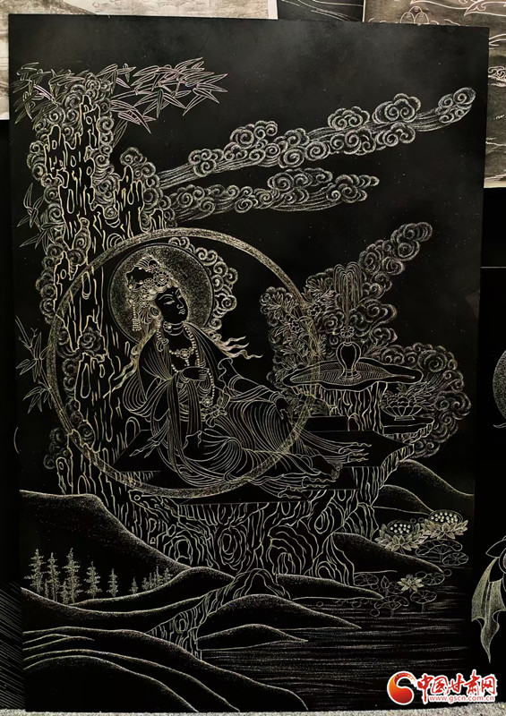 對張兆武來說,做鍥金畫從來不是“照貓畫虎”。他琢磨傳統書畫的筆墨、篆刻的力道,慢慢攢出了自己的一套刀法;創作時,心里裝的也全是敦煌——從莫高窟第112窟里“反彈琵琶”的靈動舞姿,到傳說中“九色神鹿”的溫潤模樣,都成了他刻刀下的主角。他刻出的飛天,飄帶像帶著風;刻出的菩薩,眉眼間透著莊重;金屬的光澤在畫面上流轉,明明是靜態的畫,卻像在講一段活的敦煌故事。“不用多說什么,看過的人能懂這份美。”張兆武說的這份“懂”,恰恰打破了文化和語言的距離,讓東方的古老美學,和全世界的現代審美碰出了共鳴。