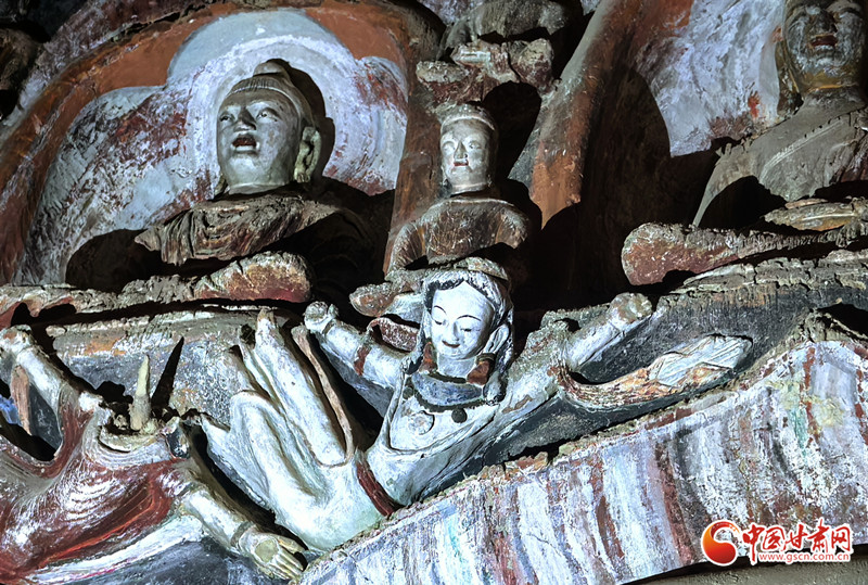 這里最具特色的是東窟一層龕楣兩側懸塑的飛天,相對作凌空飛舞之勢。金塔寺內的高肉雕彩塑飛天歷史遠早于敦煌飛天,屬洞窟藝術之罕見珍品,為全國僅有。