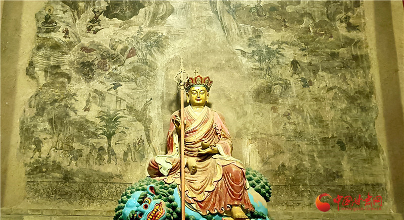 這幅壁畫繪于大佛殿內大佛身后墻壁,色彩雖已斑駁,卻仍難掩其藝術價值,是大佛殿內時代較早、藝術水準極高的作品。它距地面高1.55米,上下兩端用墨線勾出邊欄,邊欄內繪纏枝牡丹點綴;《西游記》故事圖居于正中,殘長約4.4米,殘高約2.9米,面積約12.7平方米,壁畫前今塑有地藏王菩薩像一尊。壁畫由“取水子母河”“道昧放心猿”“大戰紅孩兒”等多個獨立故事組成,畫面里險山怪石、古木溪水、云霧火海錯落交織,而師徒四人的分工設定始終清晰:豬八戒挑行李、沙僧牽馬、孫悟空持金箍棒護送,這份“固定分工”讓豬八戒的勤勞形象貫穿全程。