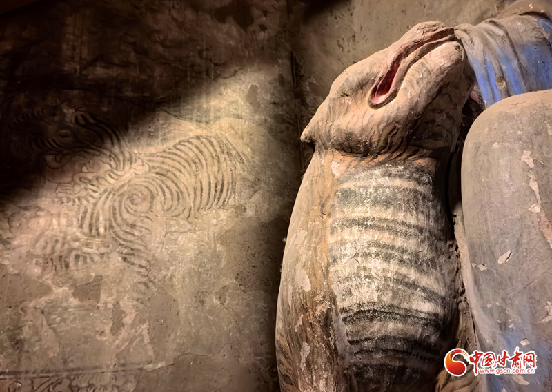 為何要將老虎塑造得如此乖巧?答案就在老虎旁邊的壁畫中。壁畫里的老虎張牙舞爪、張著大嘴,盡顯兇猛之態。而羅漢手中的老虎卻溫順如貓,這一鮮明對比,恰恰生動地說明了羅漢已將老虎降服。