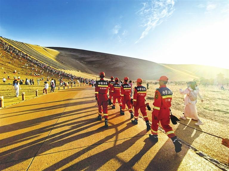 敦煌市消防救援大隊指戰員在鳴沙山月牙泉景區開展流動執勤。