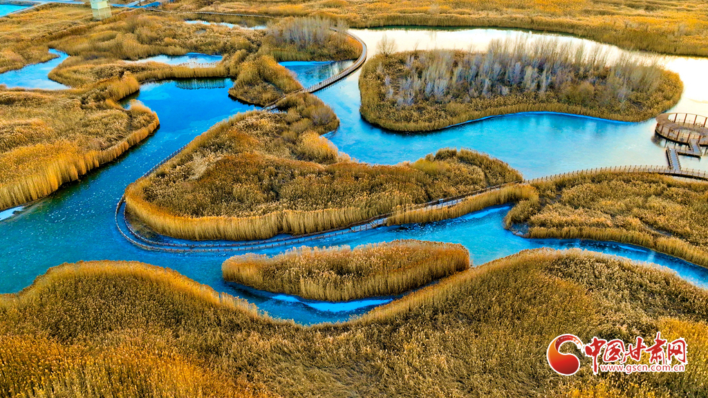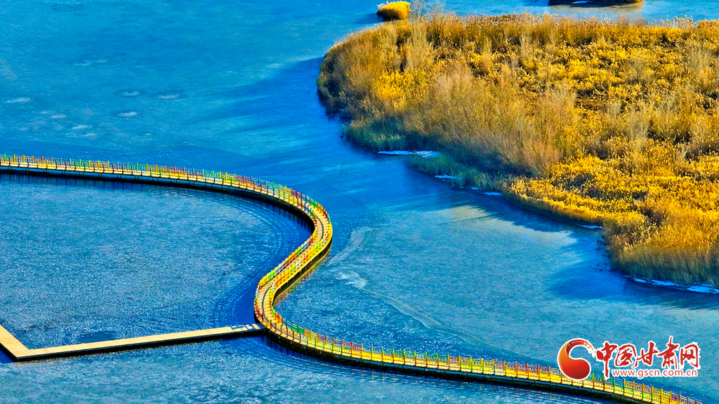 12月4日,張掖市黑河濕地國家級自然保護區內,經風霜浸染的蘆葦與蒲草披上金裝。從高空俯瞰,夕陽下的蘆葦蕩如金色海洋,蘆花隨風輕舞,碧水凝冰環繞其間,宛如一幅鋪展的濕地金畫卷,吸引眾多游客與攝影愛好者前來觀賞拍攝。